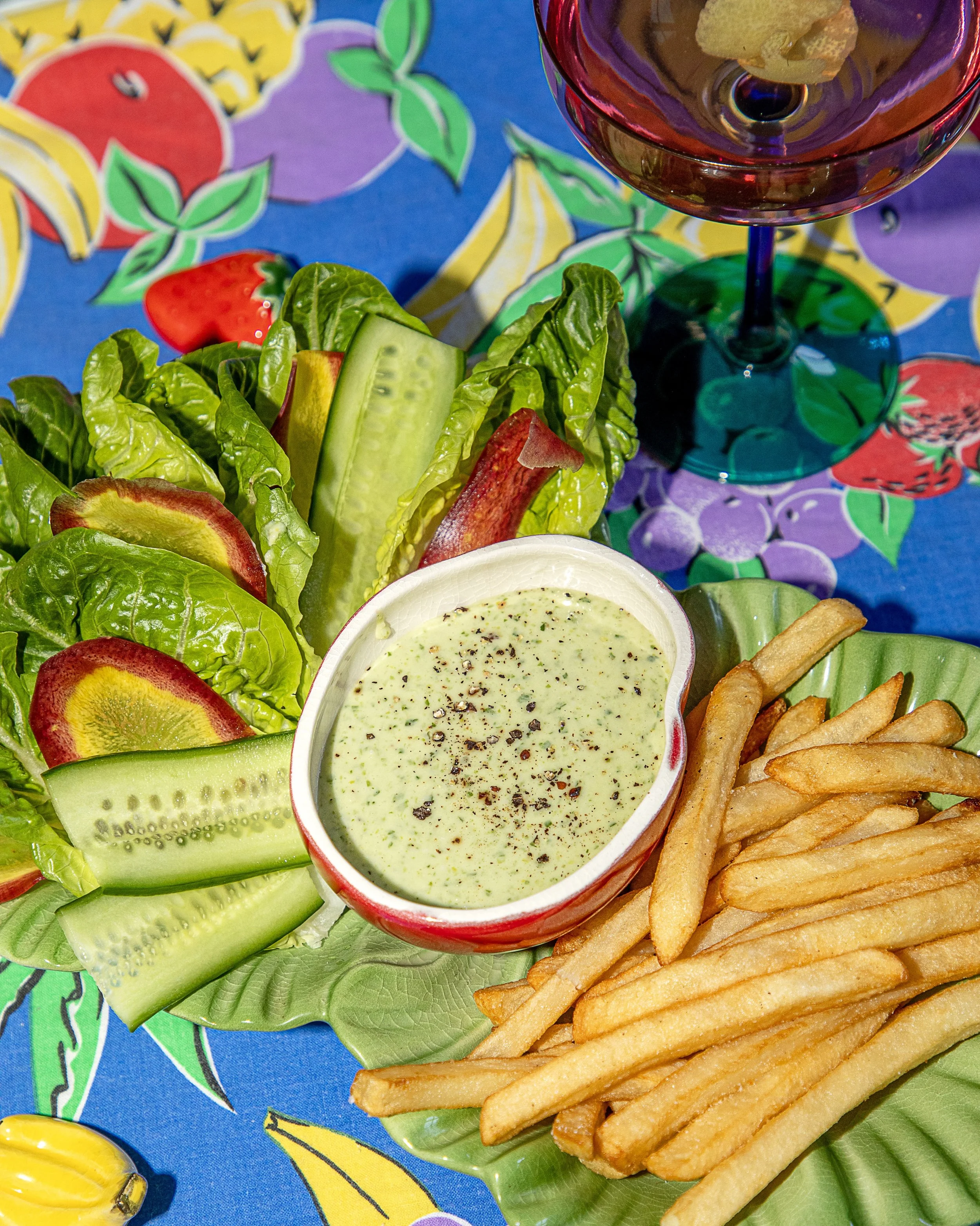 I love all my children equally, but Caesar Salad Dip is my favorite. (I don’t care for G.O.B. This is Arrested Dipvelopment.) This dipfied all expectations of how dishes can be transformed into dips. This isn’t just a Caesar dressing that’s slightly thicker and more dippable—it’s salad blended into a dip. The base of the dip was inspired by aji verde, a Peruvian green sauce made with a base of pureed romaine lettuce, which adds a subtle vegetal flavor and some of its signature color. I ate it frequently when I lived on New York’s Upper West Side (shout-out To Pio Pio!) and was reminded of it by my friend and food stylist Nick Torres during the dipvelopment process. Watching lettuce get pulverized in a food processor is a little gnarly, but trust the process and romaine calm. The water in the lettuce keeps things light and bright even after you add in all of the dairy and garlic, making it refreshingly decadent—and the best way to get yourself to eat a lot of vegetables in one sitting.